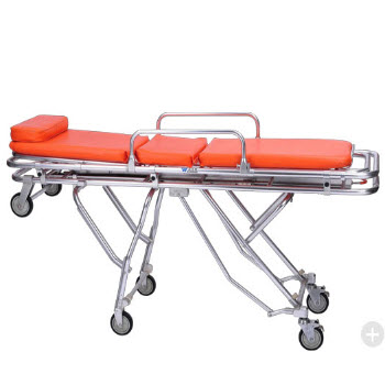 RHY-AL101救護車擔架產品特點:1.車部位有兩個輪子,高度可三檔調節,適合不同高度的車廂。2.防水海綿墊,頭部可調節,使病人舒適。3.配有自動保險鎖,上車時可以自動打開。4.折腿機構可由兩邊把手...